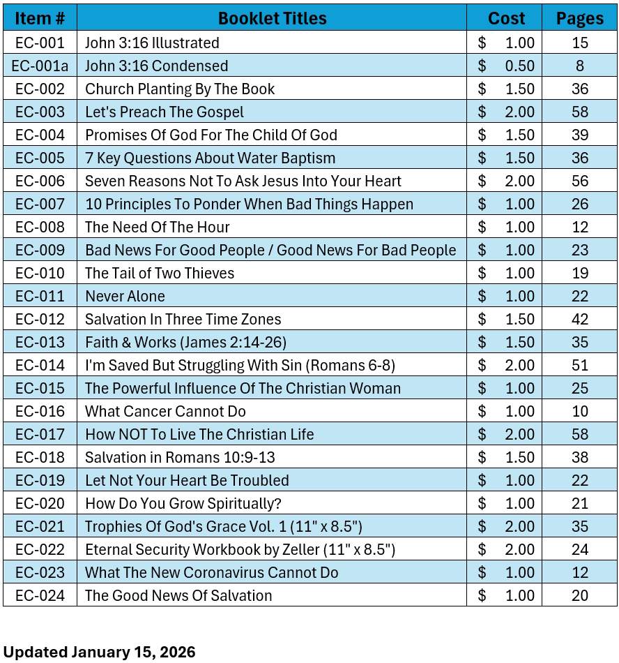 This booklet is a collection of personal testimonies that were first published in the Grace Family Journal. Though these individuals come from a myriad of religious or irreligious backgrounds, there is a common thread that unites each of them. In every case, the Holy Spirit used the Word of God to underscore their need of salvation and the wonderful truth of the Gospel of grace. Upon hearing and grasping the significance of how Jesus Christ died for their sins and rose again, they put their faith in Christ alone to save them from a Hell they deserve to a Heaven they don’t. They then knew with absolute assurance that they had received the forgiveness of all their sins and the gift of eternal life. (35-page comb-bond booklet)